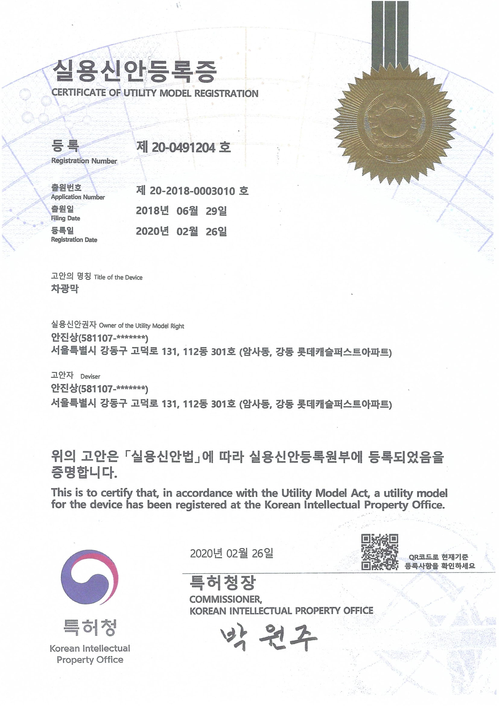실용신안등록증(차광막)