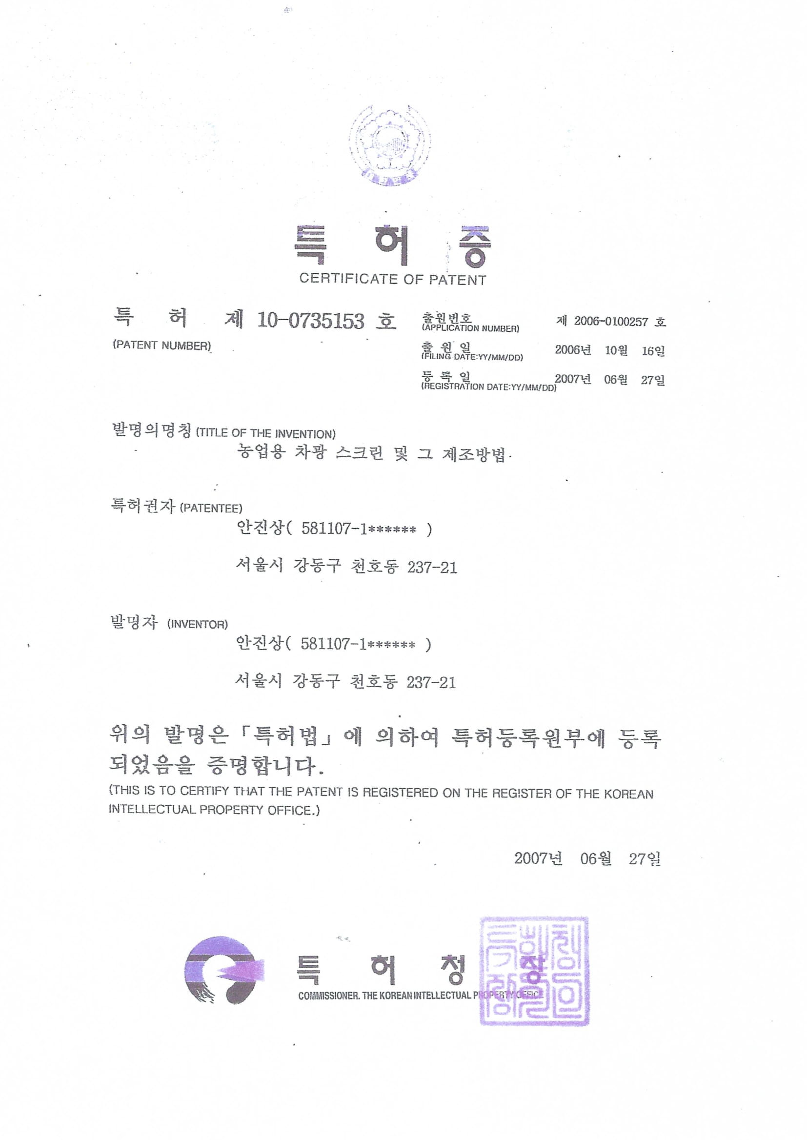 특허증(농업용 차광 스크린 및 그 제조방법)