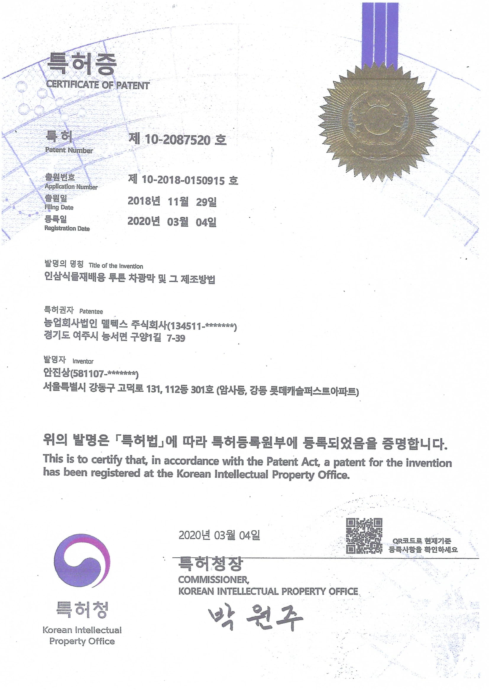 특허증(인삼식물재배용 투톤 차광막 및 그 제조방법)