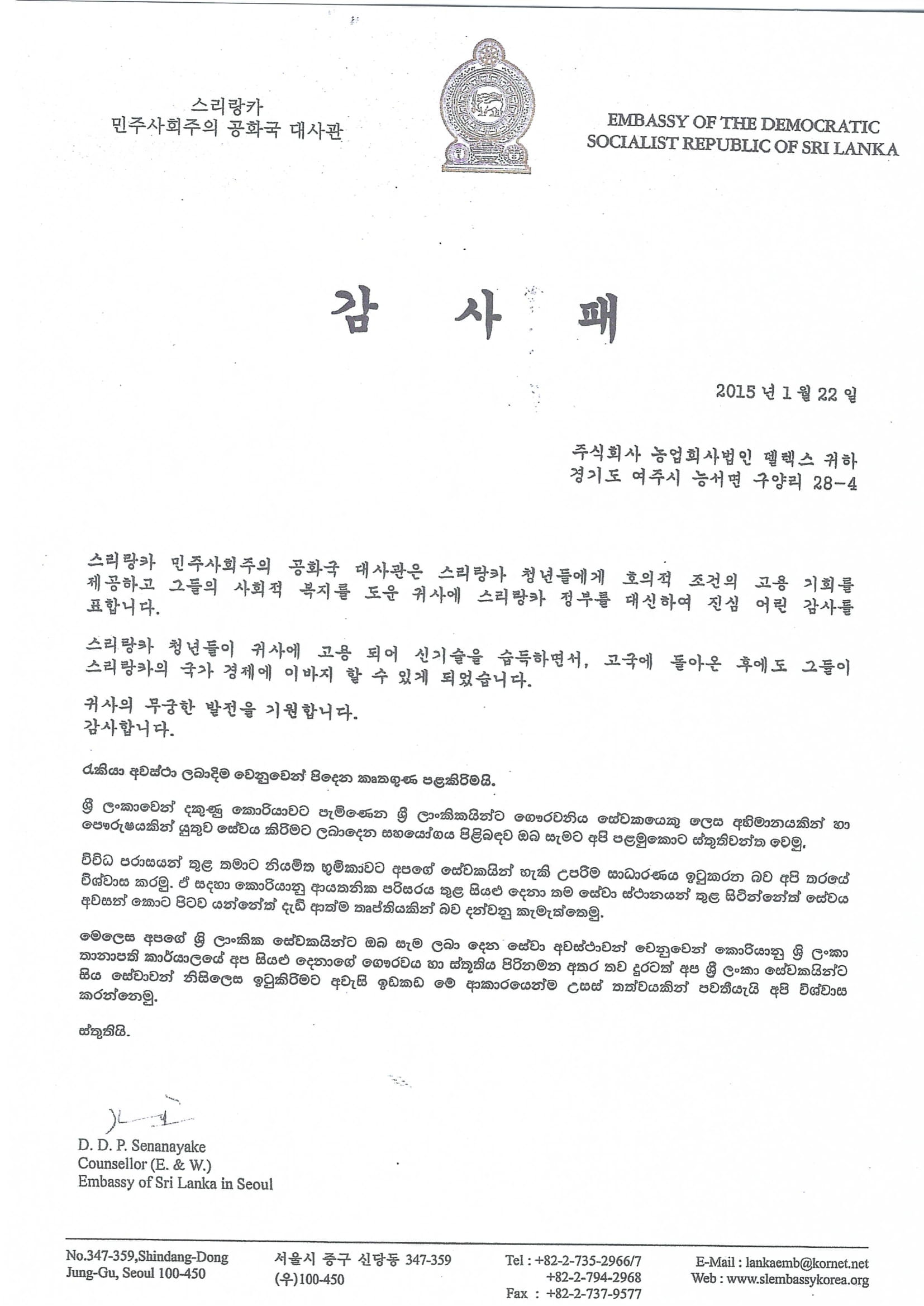 감사패(스리랑카 민주사회주의 공화국 대사관)